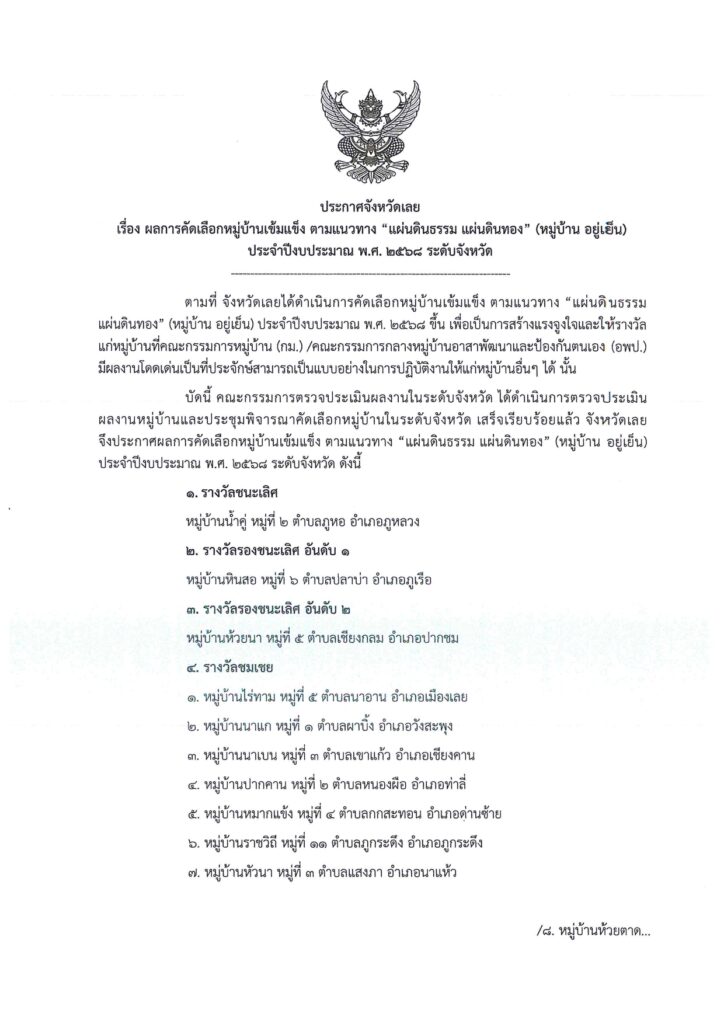 การตรวจประเมินผลงานและคัดเลือกหมู่บ้านเข้มแข็ง ตามแนวทาง “แผ่นดินธรรม แผ่นดินทอง” (หมู่บ้าน อยู่เย็น) ประจำปี 2568 จังหวัดเลย